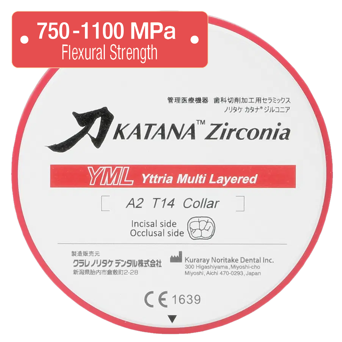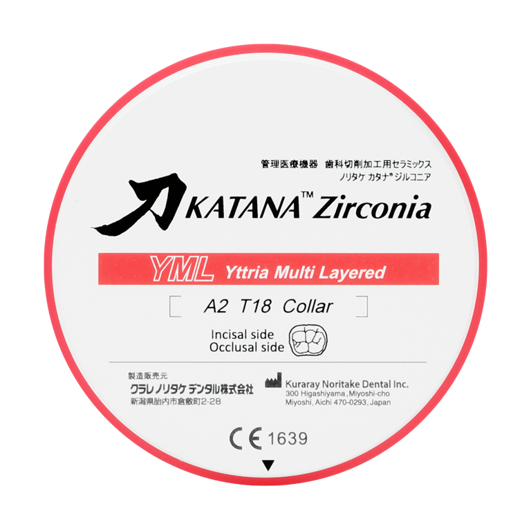 KATANA™ Zirconia YML is the latest KATANA™ multi layered disc with a well-balanced combination of color / translucency and flexural strength gradation. Thanks to Kuraray Noritake Dental’s proprietary multi layered technology, this latest development has been realized by matching three raw materials with different yttria components.